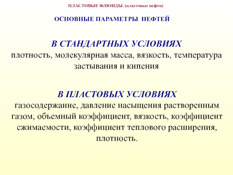 газосодержание, давление насыщения растворенным газом, объемный коэффициент, вязкость, коэффициент сжимаемости, коэффициент теплового расширения, плотность.