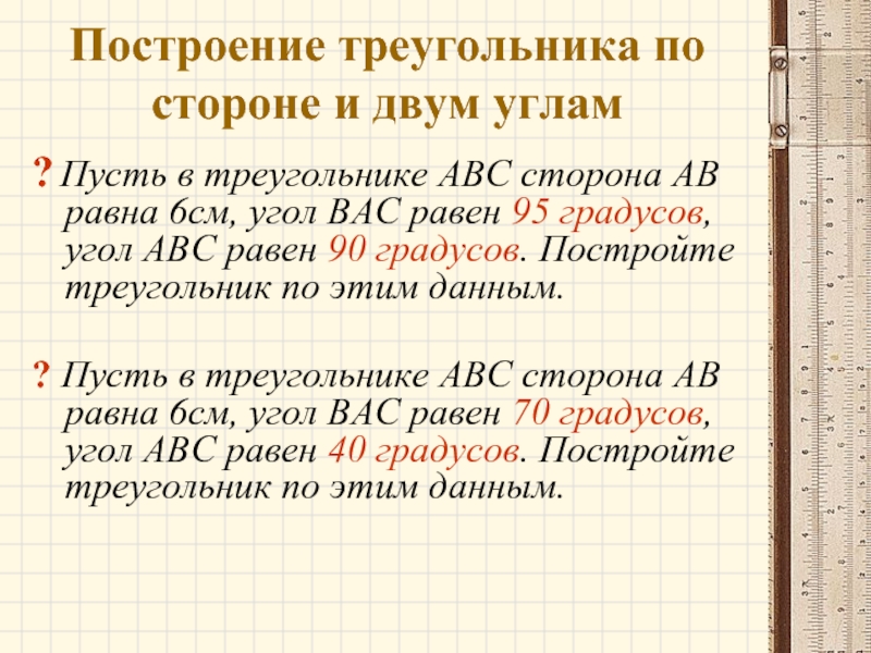 Слайд 5Построение треугольника по стороне и двум углам