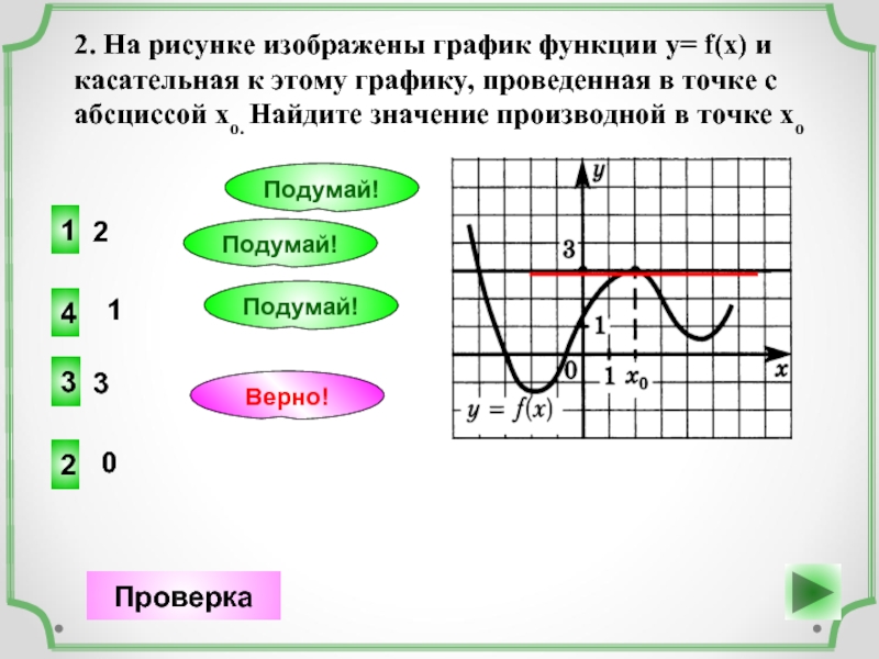 2. На рисунке изображены график функции у= f(x) и касательная к этому графику, проведенная в точке с абсциссой хо. Найдите значение производной в точке хо