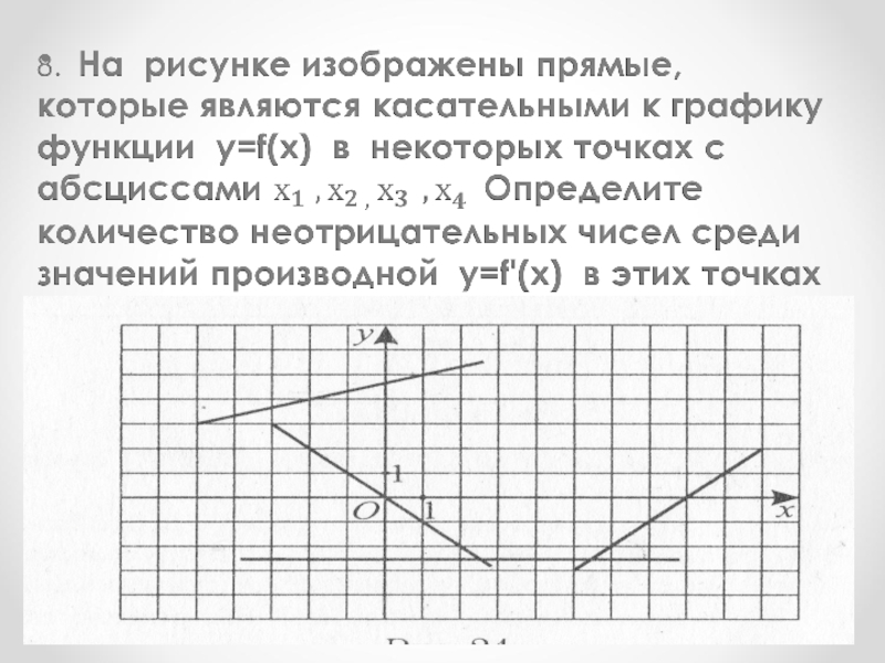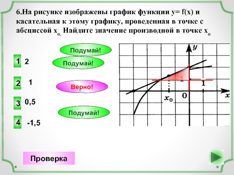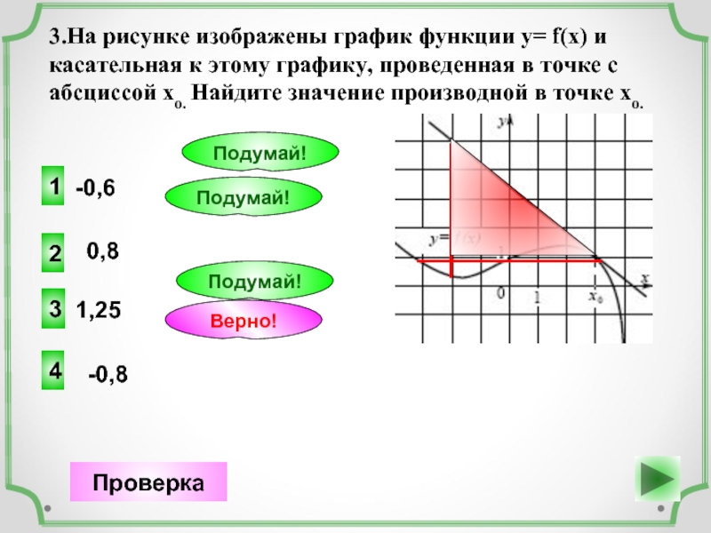 1.На рисунке изображены график функции у= f(x) и касательная к этому графику, проведенная в точке с абсциссой хо. Найдите значение производной в точке 3