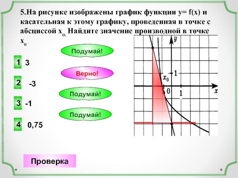 5.На рисунке изображены график функции у= f(x) и касательная к этому графику, проведенная в точке с абсциссой хо. Найдите значение производной в точке хо
