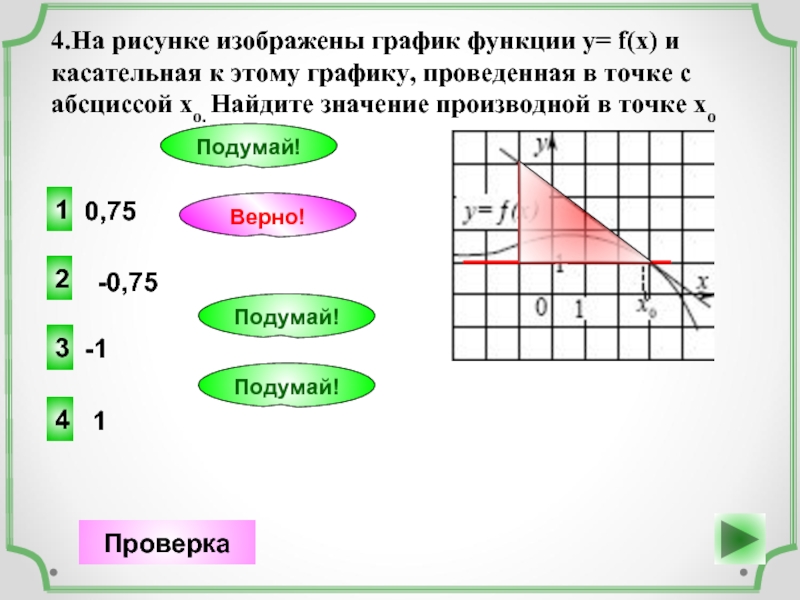 4.На рисунке изображены график функции у= f(x) и касательная к этому графику, проведенная в точке с абсциссой хо. Найдите значение производной в точке хо