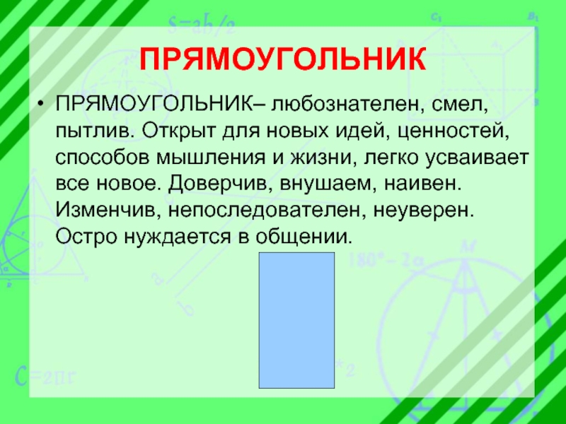 ПРЯМОУГОЛЬНИК– любознателен, смел, пытлив. Открыт для новых идей, ценностей, способов мышления