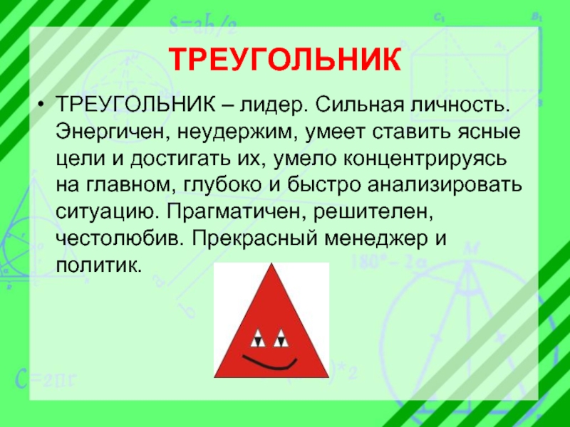 ТРЕУГОЛЬНИК – лидер. Сильная личность. Энергичен, неудержим, умеет ставить ясные цели