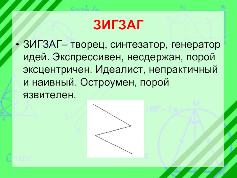 ЗИГЗАГ– творец, синтезатор, генератор идей. Экспрессивен, несдержан, порой эксцентричен. Идеалист, непрактичный