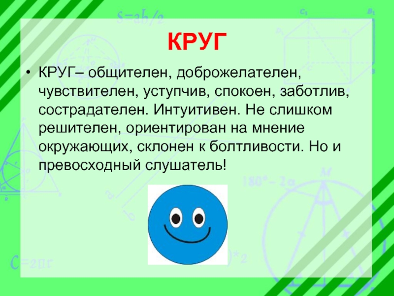 КРУГ– общителен, доброжелателен, чувствителен, уступчив, спокоен, заботлив, сострадателен. Интуитивен. Не слишком