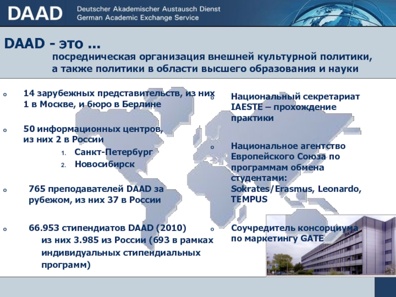 14 зарубежных представительств, из них 1 в Москве, и бюро в Берлине