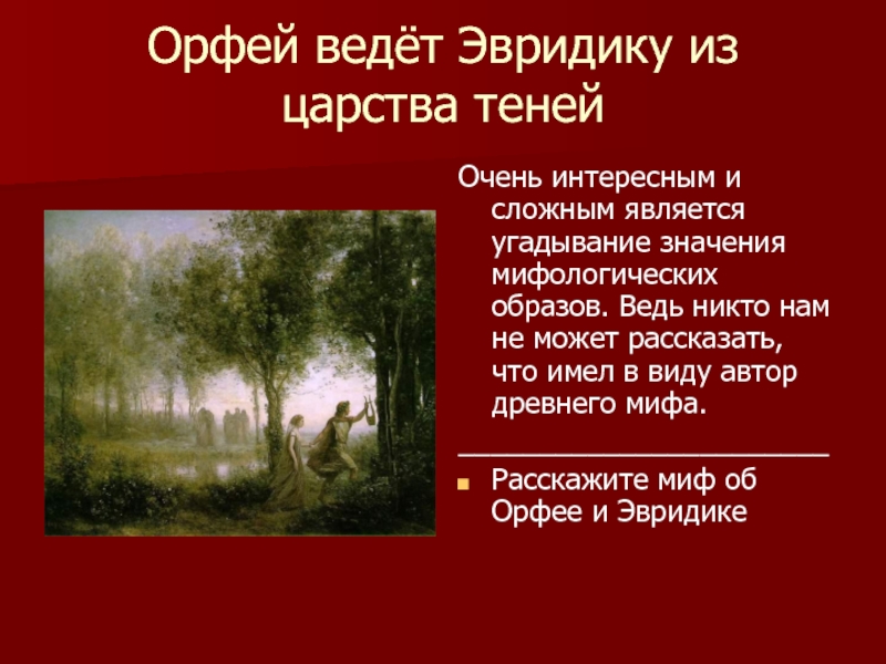 Слайд 11Орфей ведёт Эвридику из царства теней