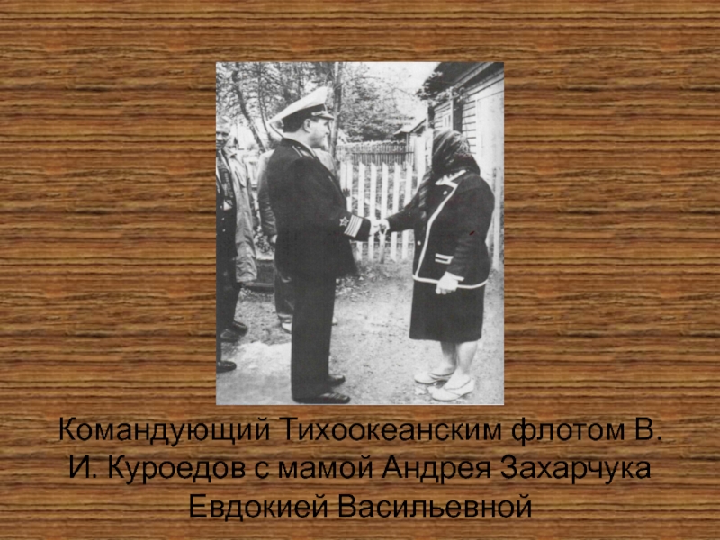 Слайд 7Командующий Тихоокеанским флотом В.И. Куроедов с мамой Андрея Захарчука Евдокией Васильевной
