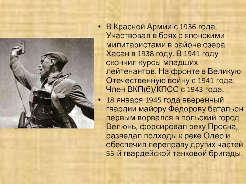 Слайд 8В Красной Армии с 1936 года. Участвовал в боях с японскими