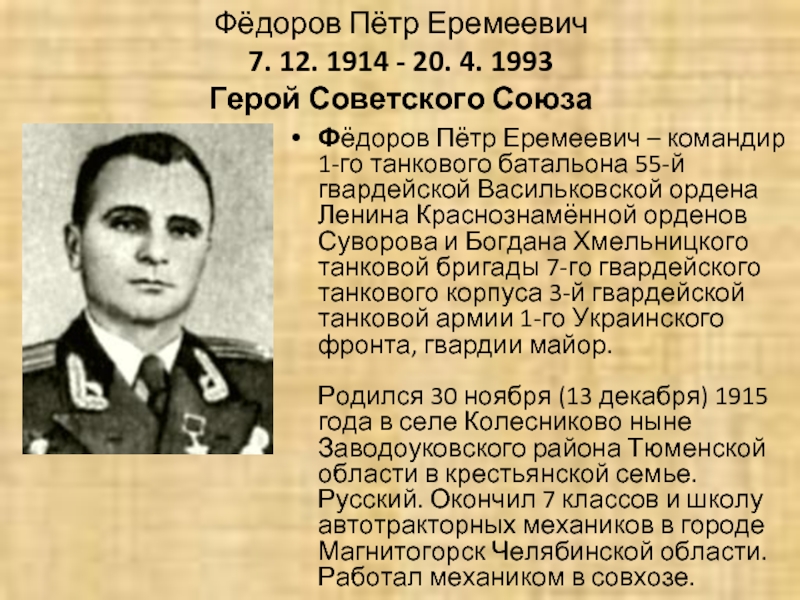 Еремеевич – командир 1-го танкового батальона 55-й гвардейской Васильковской ордена Ленина Краснознамённой орденов Суворова и Богдана Хмельницкого танковой бригады 7-го гвардейского танкового корпуса 3-й гвардейской танковой армии 1-го Украинского фронта, гвардии майор.