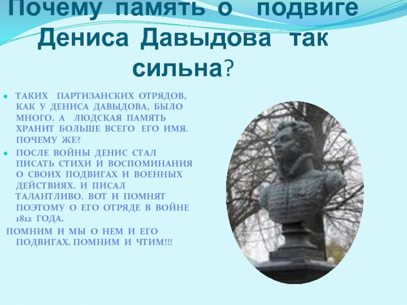 ПОСЛЕ ВОЙНЫ ДЕНИС СТАЛ ПИСАТЬ СТИХИ И ВОСПОМИНАНИЯ О СВОИХ ПОДВИГАХ И ВОЕННЫХ ДЕЙСТВИЯХ. И ПИСАЛ ТАЛАНТЛИВО. ВОТ И ПОМНЯТ ПОЭТОМУ О ЕГО ОТРЯДЕ В ВОЙНЕ 1812 ГОДА.