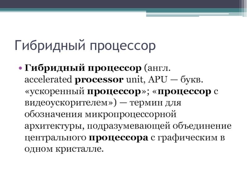 Гибридный процессор (англ. accelerated processor unit, APU — букв. «ускоренный процессор»; «процессор с видеоускорителем») —