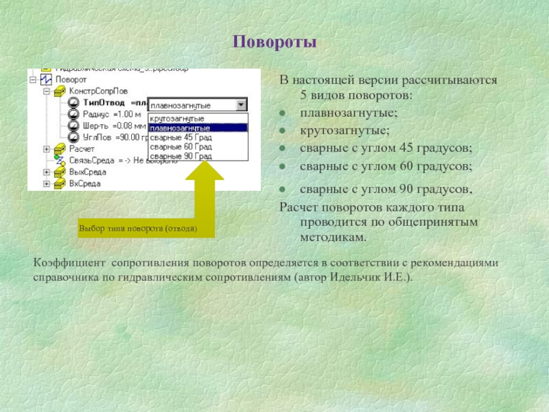 Коэффициент сопротивления поворотов определяется в соответствии с рекомендациями справочника по гидравлическим сопротивлениям (автор Идельчик И.Е.).