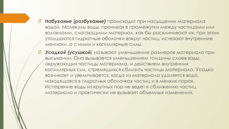 Слайд 11Набухание (разбухание) происходит при насыщении материала водой. Молекулы воды, проникая в