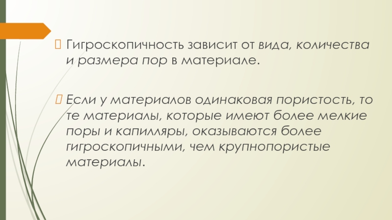 Слайд 6Гигроскопичность зависит от вида, количества и размера пор в материале.