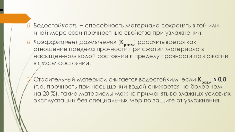 Строительный материал считается водостойким, если Кразм 0,8 (т.е. прочность при насыщении водой снижается не более чем на 20 %), такие материалы можно применять во влажных условиях эксплуатации без специальных мер по защите от увлажнения.