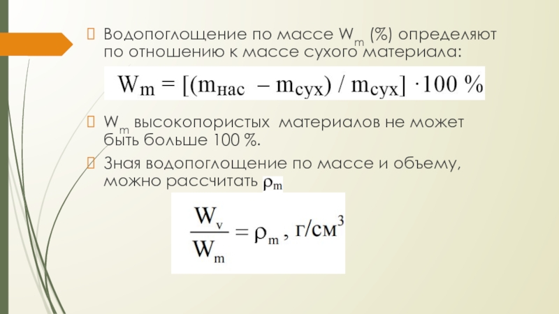 Слайд 9Водопоглощение по массе Wm (%) определяют по отношению к массе сухого