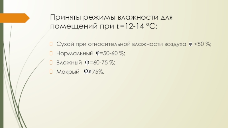 Слайд 5Приняты режимы влажности для помещений при t=12-14 °С: