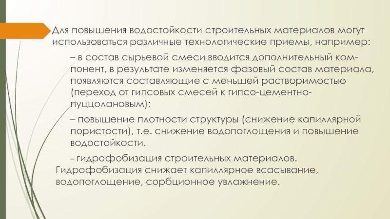 Слайд 18Для повышения водостойкости строительных материалов могут использоваться различные технологические приемы, например: