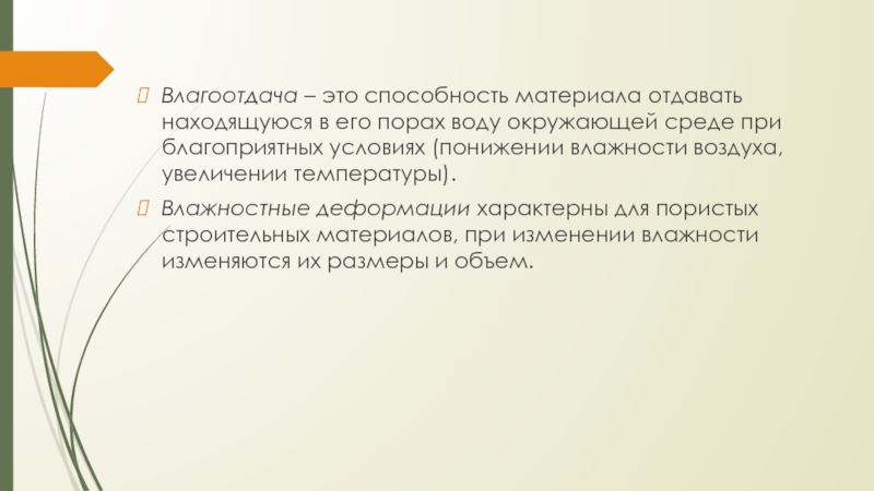 Слайд 10Влагоотдача – это способность материала отдавать находящуюся в его порах воду