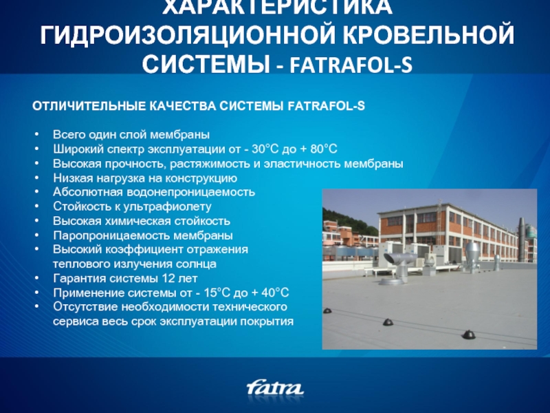 Слайд 4ХАРАКТЕРИСТИКА ГИДРОИЗОЛЯЦИОННОЙ КРОВЕЛЬНОЙ СИСТЕМЫ - FATRAFOL-S