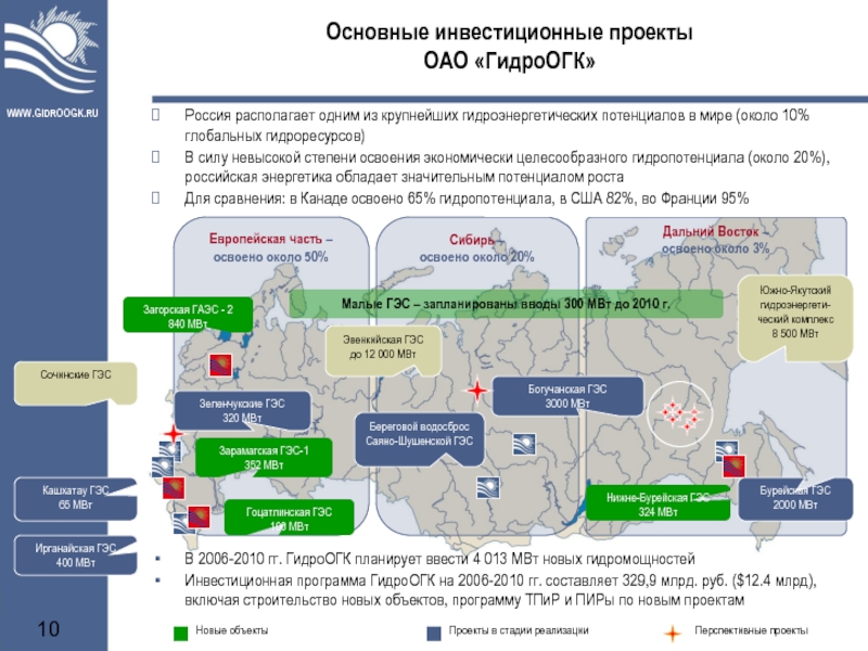Инвестиционная программа ГидроОГК на 2006-2010 гг. составляет 329,9 млрд. руб. ($12.4 млрд), включая строительство новых объектов, программу ТПиР и ПИРы по новым проектам