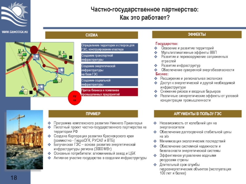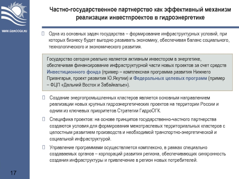 В силу специфики гидроэнергетических проектов, реализация инвестиционных планов ОАО «ГидроОГК» будет осуществляться в тесном взаимодействии с государством. Механизмы частно-государственного партнерства будут являться при этом ключевым инструментом