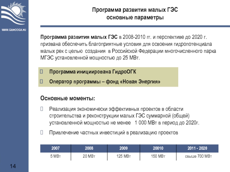Реализация экономически эффективных проектов в области строительства и реконструкции малых ГЭС суммарной (общей) установленной мощностью не менее 1 000 МВт в период до 2020г.