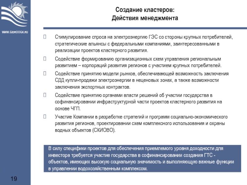 Стимулирование спроса на электроэнергию ГЭС со стороны крупных потребителей, стратегические альянсы с федеральными компаниями, заинтересованными в реализации проектов кластерного развития.