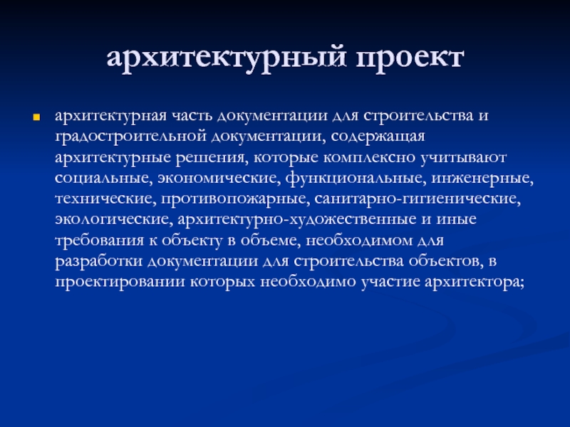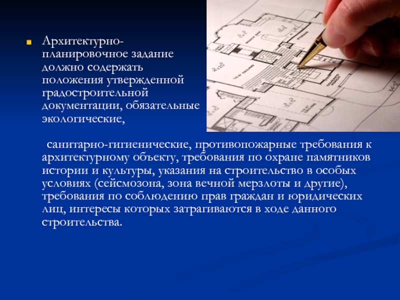 Архитектурно-планировочное задание должно содержать положения утвержденной градостроительной документации, обязательные экологические,