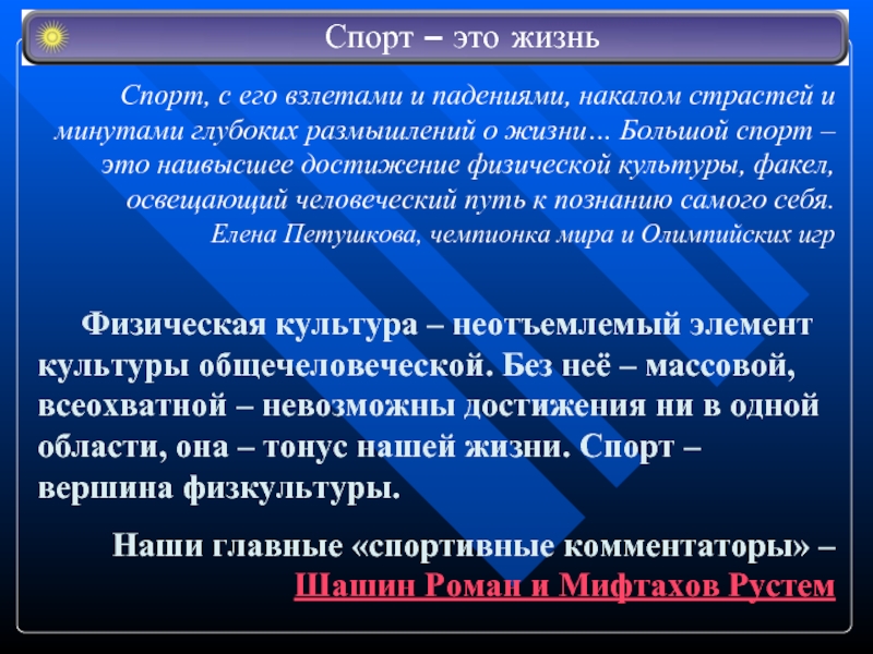 Физическая культура – неотъемлемый элемент культуры общечеловеческой. Без неё – массовой, всеохватной – невозможны достижения ни в одной области, она – тонус нашей жизни. Спорт – вершина физкультуры.