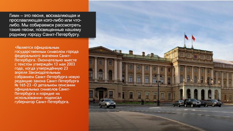 федерального значения Санкт-Петербурга. Окончательно вместе с текстом утверждён 13 мая 2003 года, когда утверждённую 23 апреля Законодательным собранием Санкт-Петербурга новую редакцию закона Санкт-Петербурга № 165-23 «О детальном описании официальных символов Санкт-Петербурга и порядке их использования» подписал губернатор Санкт-Петербурга.