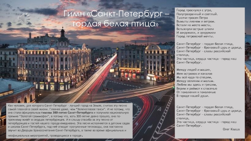 Как человек, для которого Санкт-Петербург – лучший город на Земле, считаю эту песню самой главной в своей жизни. Главнее даже, чем “Зеленоглазое такси”. И не потому, что она стала официальным гимном 300-летия Санкт-Петербурга и получила национальную премию “Золотой граммофон”, а потому что, хоть 300-летие давно прошло, она по-прежнему живёт в сердцах петербуржцев. И я слышу спасибо за эту песню от петербуржцев и гостей нашего города ежедневно. Эта песня исполняется в детских садах и школах Санкт-Петербурга, под неё отходят прогулочные теплоходы, она постоянно звучит во Дворцах Бракосочетания Санкт-Петербурга, а также во время официальных и неофициальных мероприятий, проводящихся в городе.