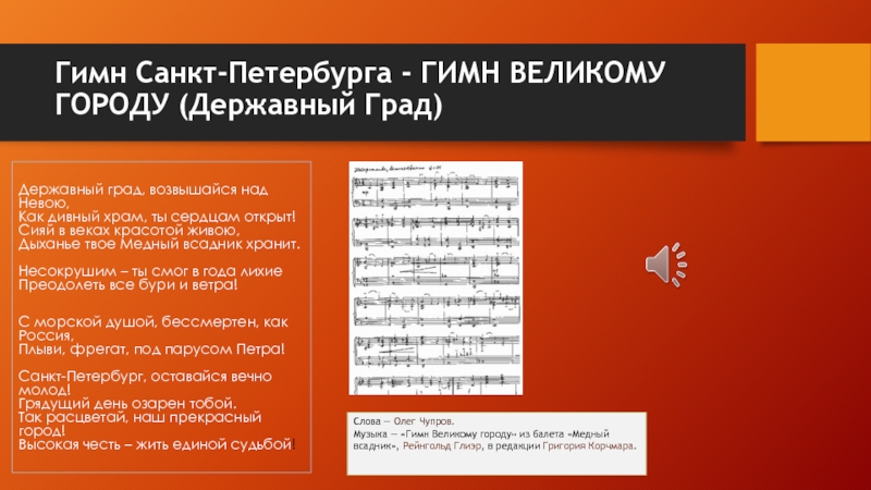 Музыка — «Гимн Великому городу» из балета «Медный всадник», Рейнгольд Глиэр, в редакции Григория Корчмара.