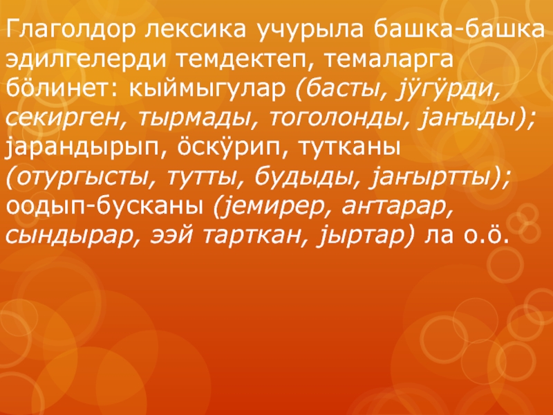 Слайд 3Глаголдор лексика учурыла башка-башка эдилгелерди темдектеп, темаларга бöлинет: кыймыгулар (басты, jÿгÿрди,