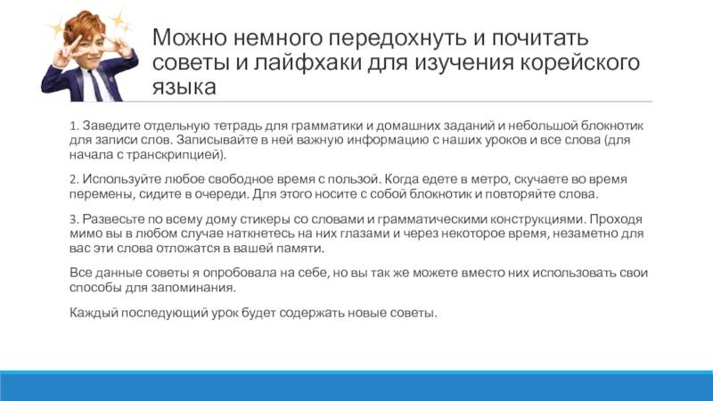А те, кто занимается по кпоп песням, могут выписать данные слова и учить их уже после окончания курса или если позволяет время, в дополнительную нагрузку к тем словам, которые учат через кпоп песни.