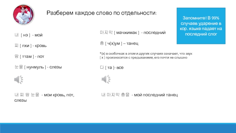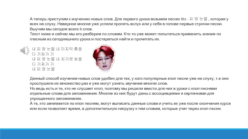 Но ведь есть и те, кто не слушает кпоп, поэтому мы решили ввести для них в уроки с кпоп песнями отдельные слова для запоминания. Многие из них будут даны с ассоциациями и картинками для упрощенного запоминания.