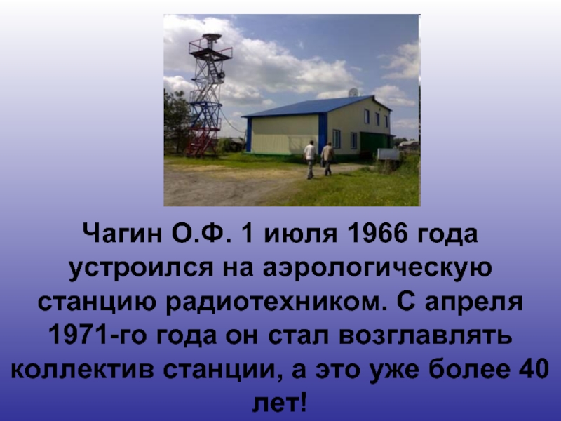 Слайд 8Чагин О.Ф. 1 июля 1966 года устроился на аэрологическую станцию радиотехником.