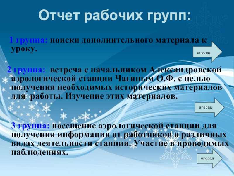 2 группа: встреча с начальником Александровской аэрологической станции Чагиным О.Ф. с целью получения необходимых исторических материалов для работы. Изучение этих материалов.