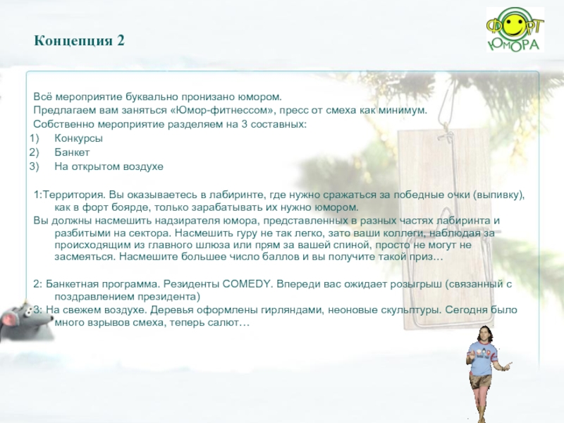 1:Территория. Вы оказываетесь в лабиринте, где нужно сражаться за победные очки (выпивку), как в форт боярде, только зарабатывать их нужно юмором.