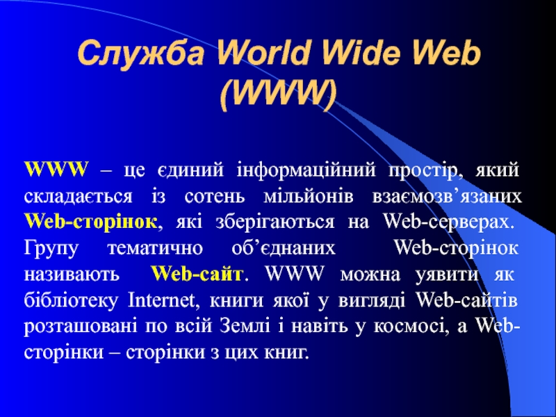 складається із сотень мільйонів взаємозв’язаних Web-сторінок, які зберігаються на Web-серверах. Групу тематично об’єднаних Web-сторінок називають Web-сайт. WWW можна уявити як бібліотеку Internet, книги якої у вигляді Web-сайтів розташовані по всій Землі і навіть у космосі, а Web-сторінки – сторінки з цих книг.