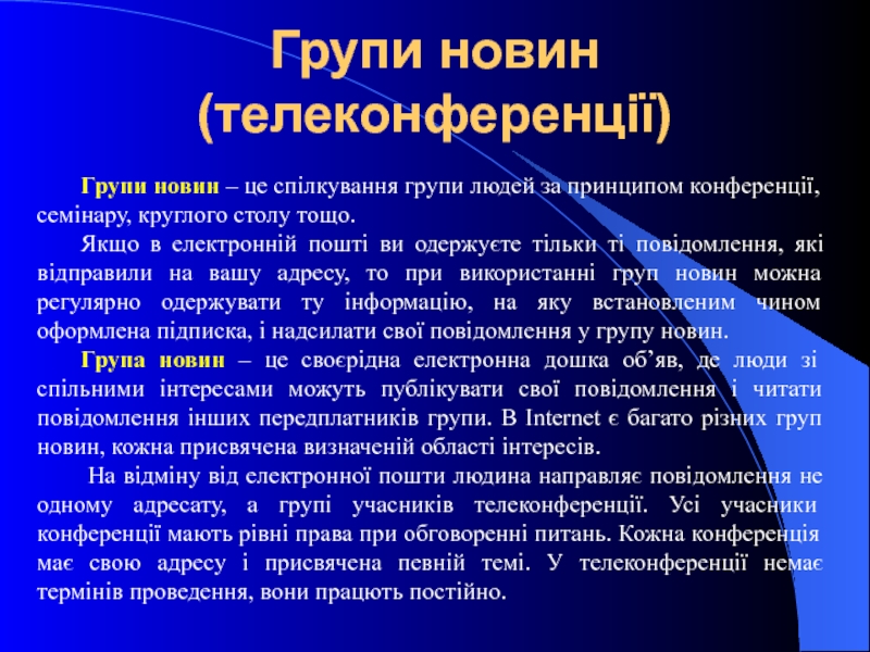 Якщо в електронній пошті ви одержуєте тільки ті повідомлення, які відправили на вашу адресу, то при використанні груп новин можна регулярно одержувати ту інформацію, на яку встановленим чином оформлена підписка, і надсилати свої повідомлення у групу новин.
