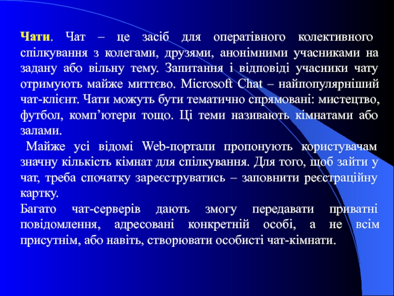 Слайд 19Чати. Чат – це засіб для оператівного колективного спілкування з колегами,