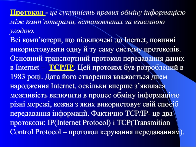 Всі комп’ютери, що підключені до Inernet, повинні використовувати одну й ту саму систему протоколів. Основний транспортний протокол передавання даних в Internet – TCP/IP. Цей протокол був розроблений в 1983 році. Дата його створення вважається днем народження Internet, оскільки вперше з’явилася можливість включити в процес обміну інформацією різні мережі, кожна з яких використовує свій спосіб передавання інформації. Фактично TCP/IP- це два протоколи: IP(Internet Protocol) і TCP(Transmition Control Protocol – протокол керування передаванням).