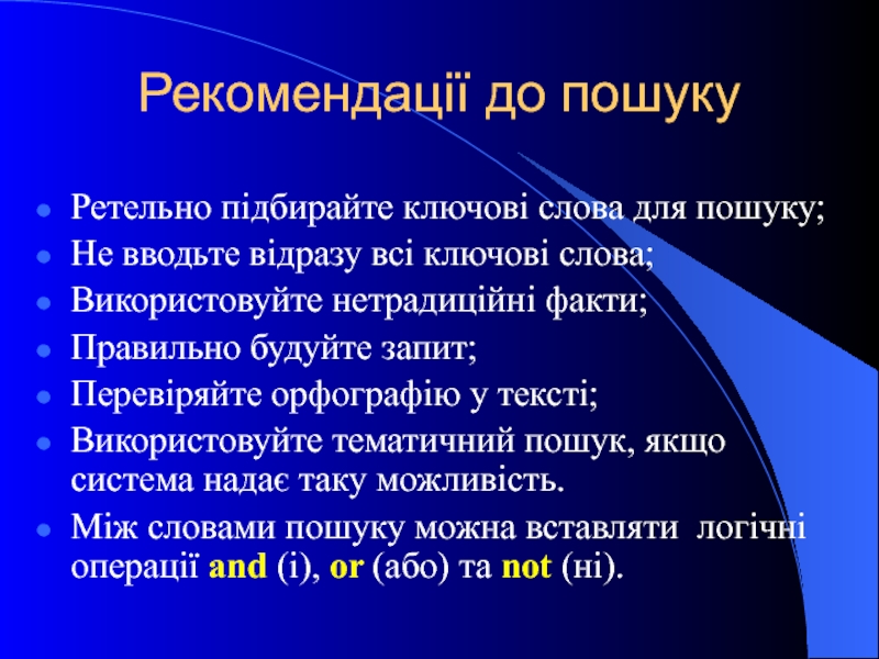 Між словами пошуку можна вставляти логічні операції and (і), or (або) та not (ні).