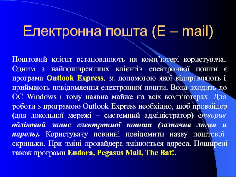 з найпоширеніших клієнтів електронної пошти є програма Outlook Express, за допомогою якої відправляють і приймають повідомлення електронної пошти. Вона входить до ОС Windows і тому наявна майже на всіх комп’ютерах. Для роботи з програмою Outlook Express необхідно, щоб провайдер (для локольної мережі – системний адміністратор) створив обліковий запис електронної пошти (зазначив логин и пароль). Користувачу повинні повідомити назву поштової скриньки. При зміні провайдера змінюється адреса. Поширені також програми Eudora, Pegasus Mail, The Bat!.