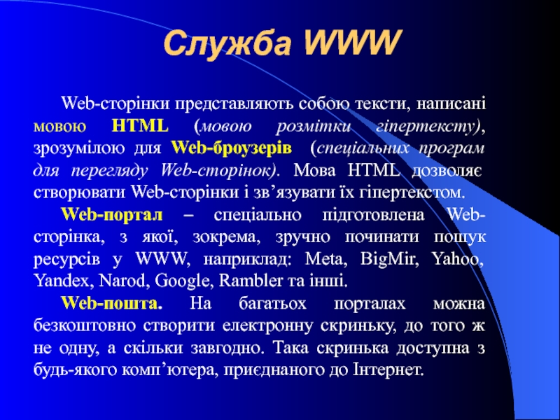 зрозумілою для Web-броузерів (спеціальних програм для перегляду Web-сторінок). Мова HTML дозволяє створювати Web-сторінки і зв’язувати їх гіпертекстом.