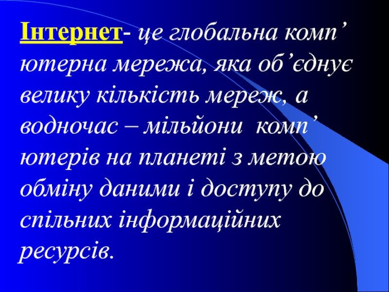 Слайд 2Інтернет- це глобальна комп’ютерна мережа, яка об’єднує велику кількість мереж, а