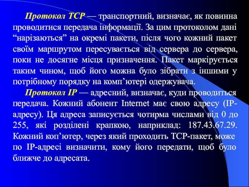 Для передачі повідомлень на конкретні комп’ютери в Internet протокол ТСР/ІР